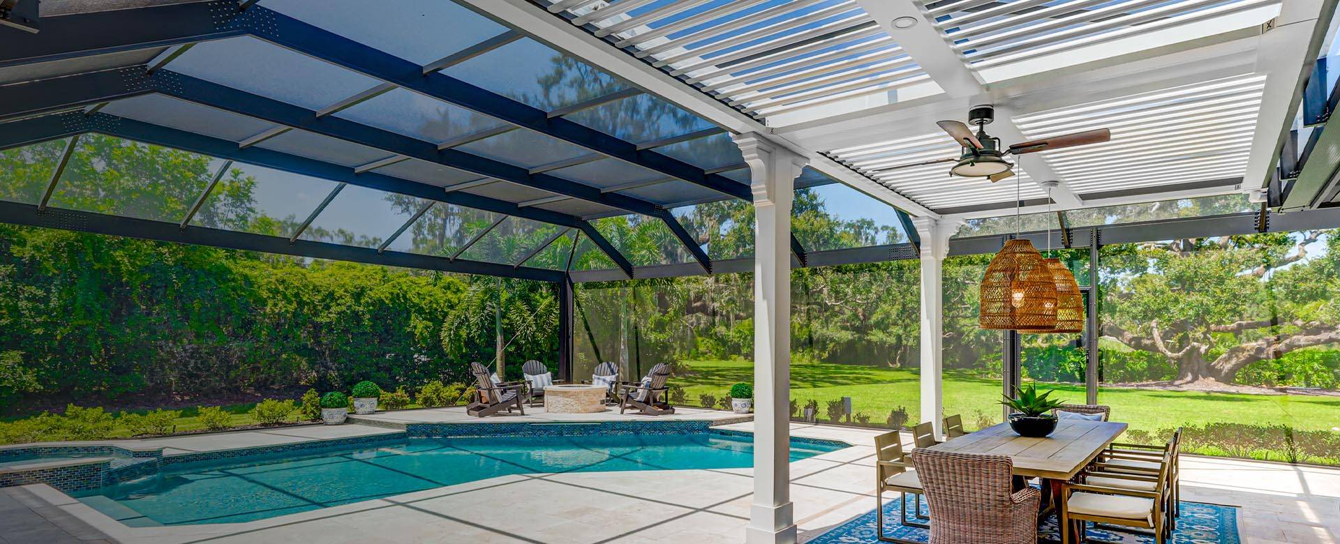 Pergolas add beauty, comfort, and outdoor living with protection from the sun. We love our sunny days in Sarasota, but the sweltering heat can be an issue. With a custom pergola in Sarasota, you can control the sunlight, cool the area below, and increase airflow. Absolute Aluminum is proud to feature the award-winning StruXure Pivot and Pivot XL. These pergolas feature automated louvers that are remotely controlled to allow sun or shade into your space. And if it rains, this automated smart pergola will close the louvers, keeping the rain outside. Options like ceiling fans, motorized screens, or accent lighting are also available.